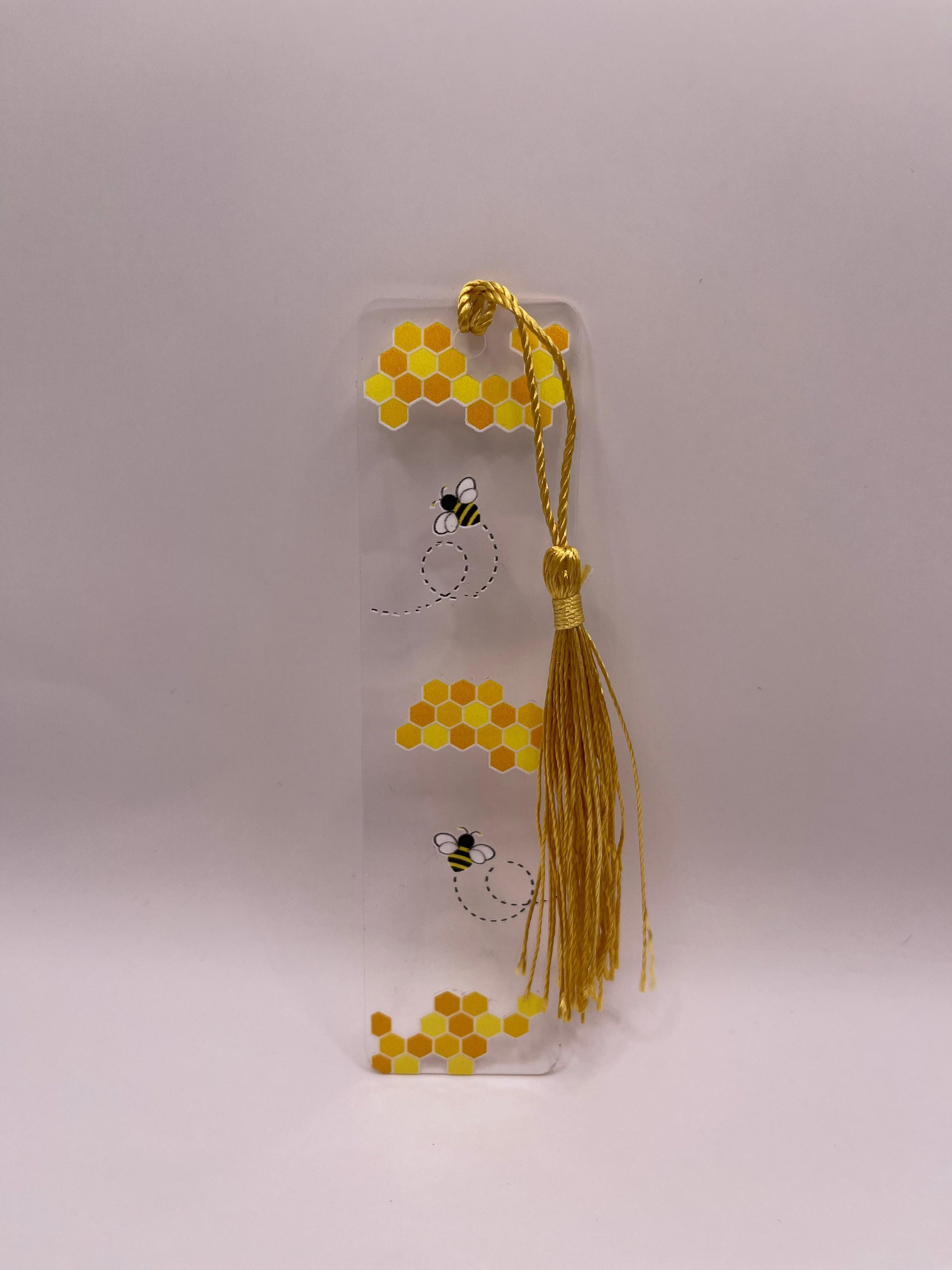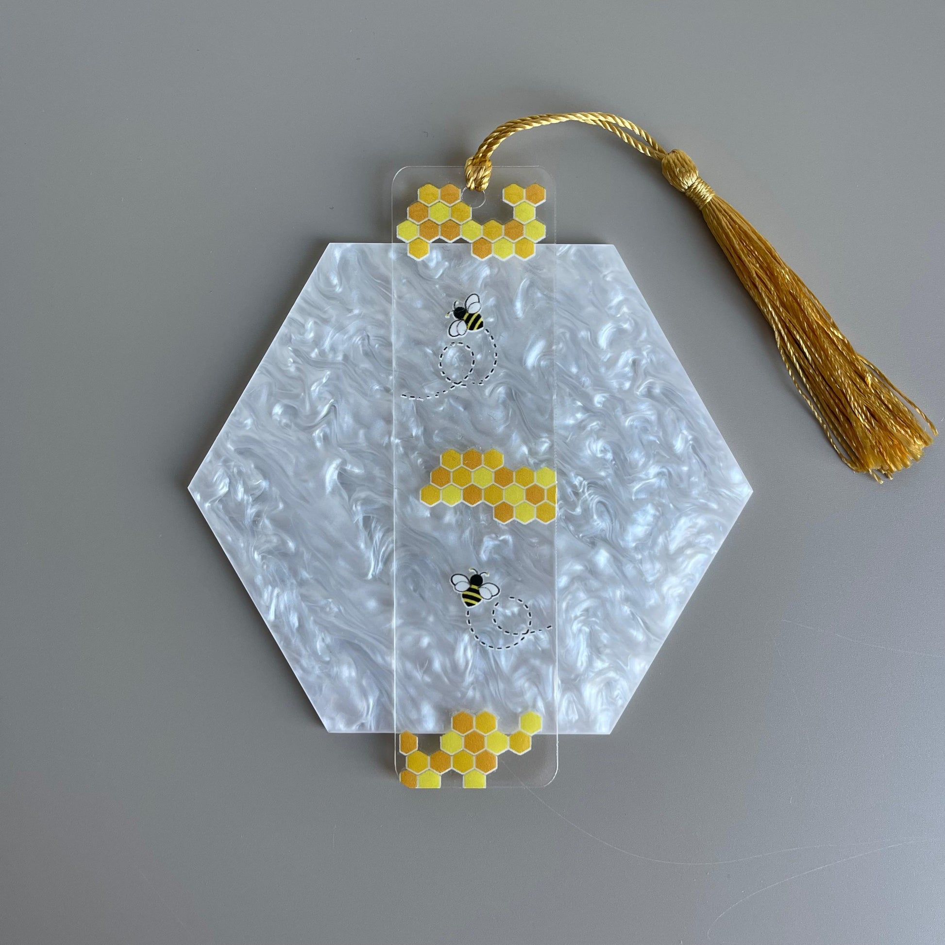 ✔ Uniek & stijlvol – Heldere acryl boekenlegger met een speels bijenthema en honingraatmotief.