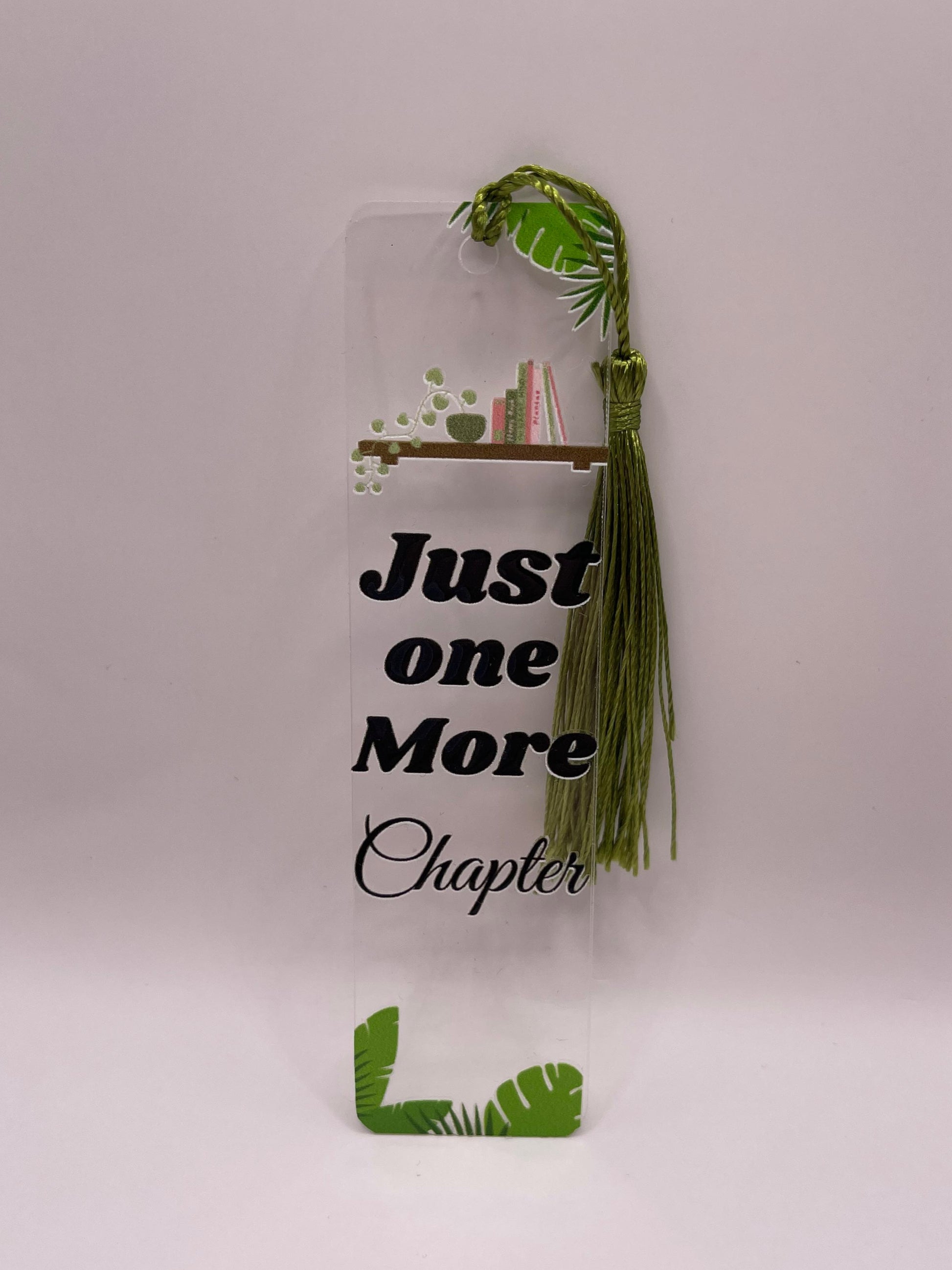 Met deze prachtige, handgemaakte boekenlegger hoef je nooit meer je plek kwijt te raken in je favoriete boek. De transparante boekenlegger is voorzien van de inspirerende tekst “Just one more chapter”, perfect voor iedereen die steeds weer één hoofdstuk extra wil lezen.