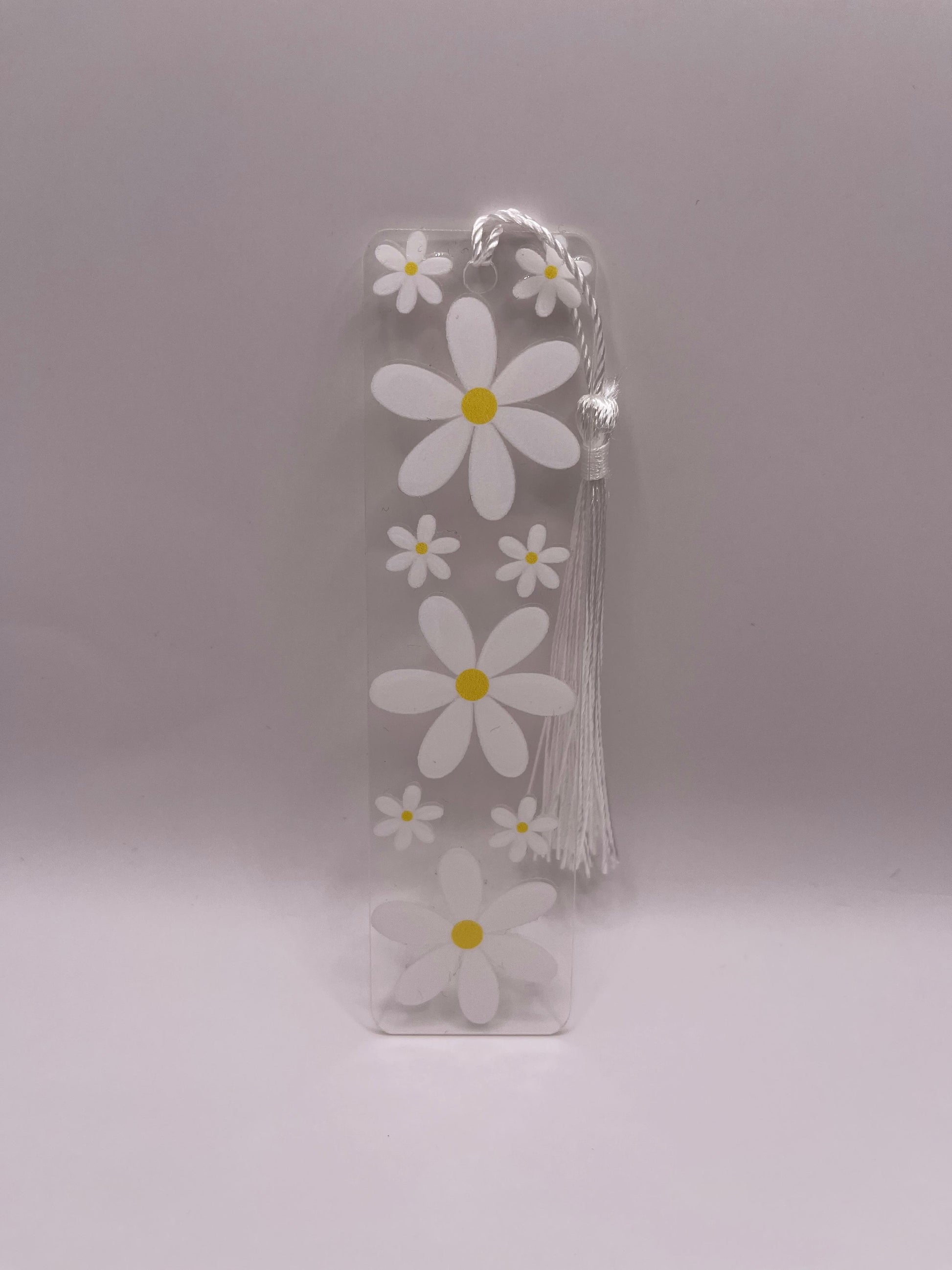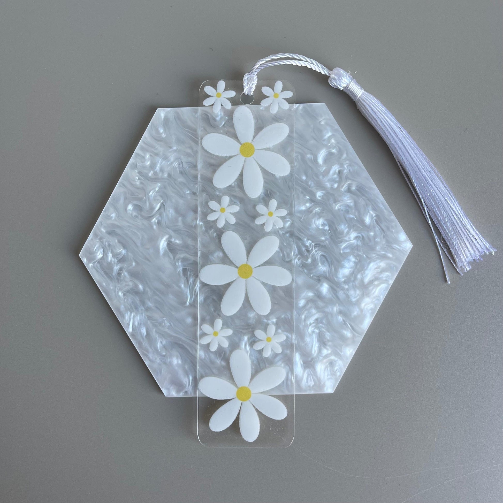 ✔ Uniek design – Heldere acryl boekenlegger met sierlijke witte madeliefjes en gele details.